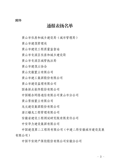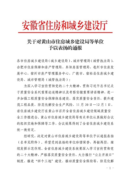 近日,安徽省住房和城鄉(xiāng)建設廳印發(fā)《關于對黃山市住房和城鄉(xiāng)建設局等單位予以表揚的通報》,《通報》指出,11月30日-12月1日,省住房和城鄉(xiāng)建設廳在黃山市召開全省住房建設領域質量安全工作推進會,會議效果得到全省住房城鄉(xiāng)建設系統(tǒng)一致肯定,并對在此次會議認真做好組織實施和保障的單位予以通報表揚,黃山市建工集團股份有限公司作為唯一一家本土建筑施工企業(yè)榮獲表揚。