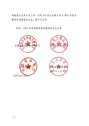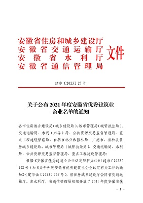 根據(jù)《安徽省優(yōu)秀建筑業(yè)企業(yè)認定暫行辦法》和《關于開展安徽省優(yōu)秀建筑業(yè)企業(yè)認定有關工作的通知》。省住房城鄉(xiāng)建設廳會同省交通運輸廳、省水利廳、省通信管理局組織開展了2021年度安徽省優(yōu)秀建筑企業(yè)認定工作。