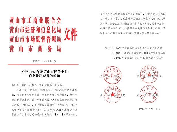 日前,由黃山市工商聯(lián)、市經(jīng)信局、市監(jiān)管局及市商務(wù)局聯(lián)合發(fā)布2022年度黃山市民營企業(yè)納稅及營銷收入百強名單公布,黃山建工集團連續(xù)多年再次實力入圍,獲此殊榮!