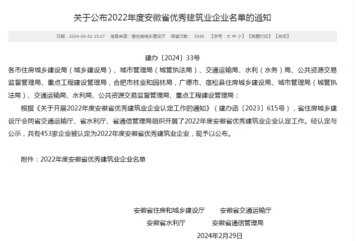近日,安徽省住房和城鄉(xiāng)建設(shè)廳發(fā)布了“2022年度安徽省優(yōu)秀建筑業(yè)企業(yè)”名單,黃山建工集團(tuán)憑借企業(yè)經(jīng)營(yíng)發(fā)展、管理創(chuàng)新能力、企業(yè)建造能力、企業(yè)文化建設(shè)、社會(huì)責(zé)任履行等方面的卓越表現(xiàn)再次名列榜單――建筑工程總承包類(特級(jí)、一級(jí)類別)省優(yōu)秀建筑業(yè)企業(yè),連續(xù)多年斬獲該項(xiàng)殊榮。